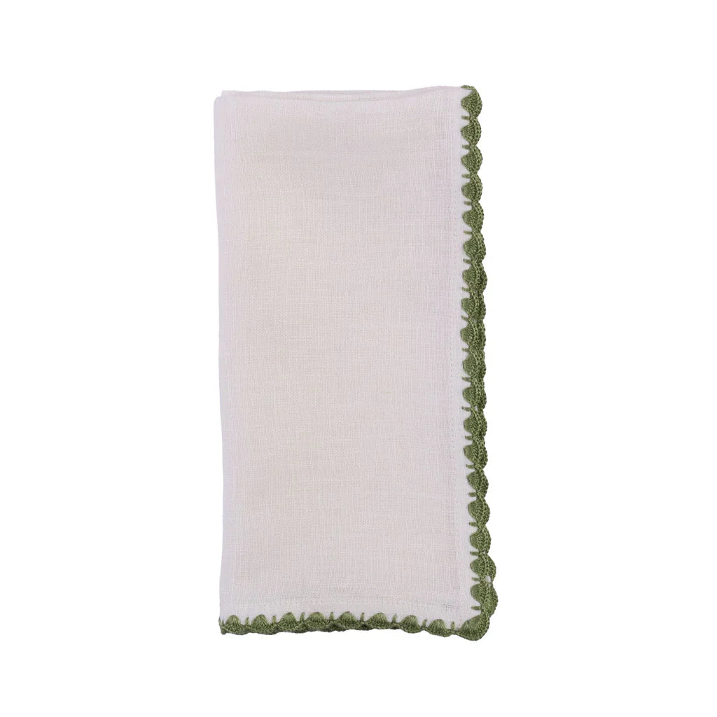 Luxury brand and social enterprise from Egypt, Malaika Linens works with the finest Egyptian cotton & linen to create intricate works of art. At the heart of Malaika's mission is to uplift underprivileged women within the community, who are empowered to learn & preserve thread-work skills and build financial independence. The Crochet Napkins by Malaika Linens  add a touch of handcrafted charm to tablescapes. Each napkin is finished with a delicate hand-crocheted border in a complementary hue, bringing a chic pop of color to your place setting.