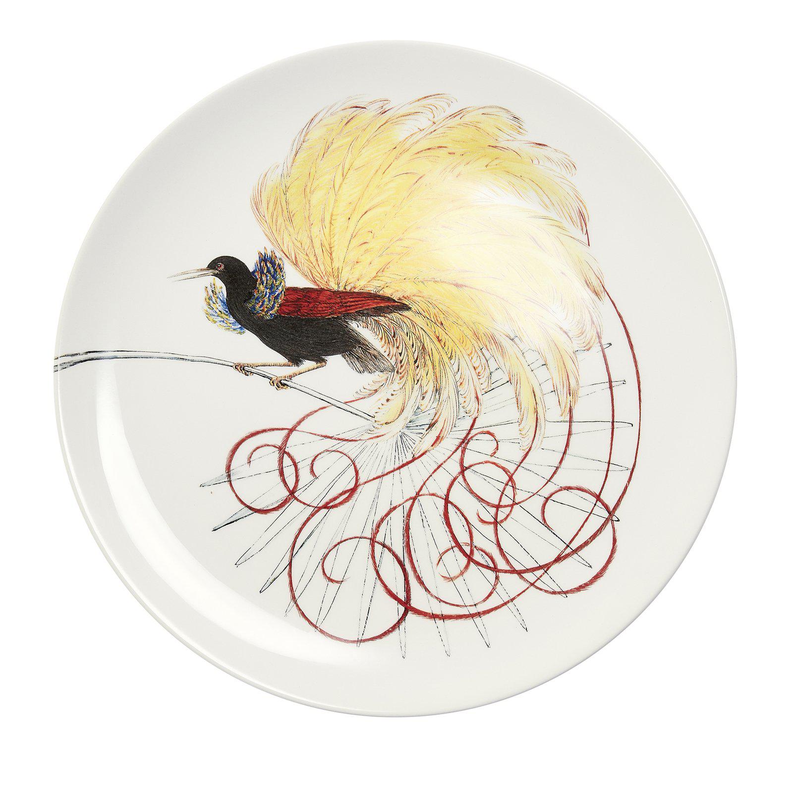 The Birds of Paradise Collection by Laboratorio Paravicini consists of an assortment of six different plates. This Milan based brand is famous for applying the finest traditions of Italian pottery in its designs. Entirely hand-crafted, they each depict a unique but cohesive design featuring elaborately rendered birds perched on a palm leaf. Every plate vividly highlights the exotic plumage of each bird beautifully illustrated in an array of colors. This plate can be combined with more of the same or mixed and matched with others in the collection for a magnificent tablescape. It is available as a dinner and charger.Â