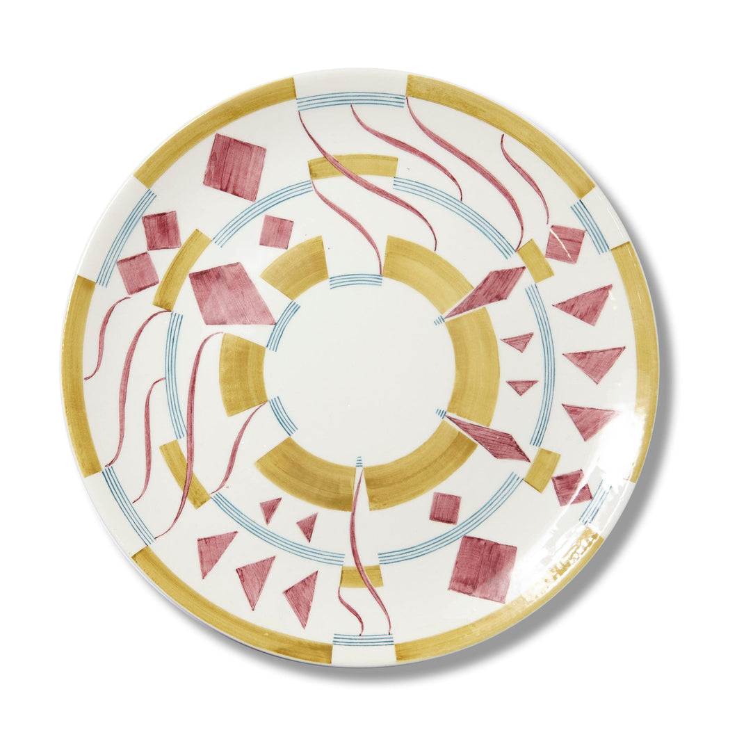 The Gymmetria Collection consists of a set of nine unique plates. Each plate lets your imagination run free, with an Art-deco inspired design that adds glamour to your home. This collection can be used to decorate walls or set the perfect table. Hand crafted and painted, each line and shape is carefully thought out and balanced by the use of color. Mix and match your favorite plates from this collection with the Athletae Gymmetria Collection. This plate is available as a charger, dinner, dessert and soup plate.Â