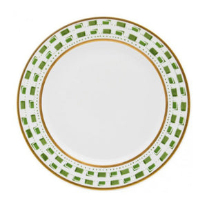 Combining a two century old tradition with the most advanced modern technology has enabled Royal Limoges to become the oldest existing porcelain factory in Limoges, France. Since its beginning in 1816, the family-owned company has made its own clay and designed its exclusive patterns in-house. The La Bocca Green collection by Royal Limoges features a fresh design of hand-painted moss green squares on white limoges porcelain, complete with gilded borders. This dessert plate is part of a dinnerware collection that adds an elevated feel to any tablescape.Â