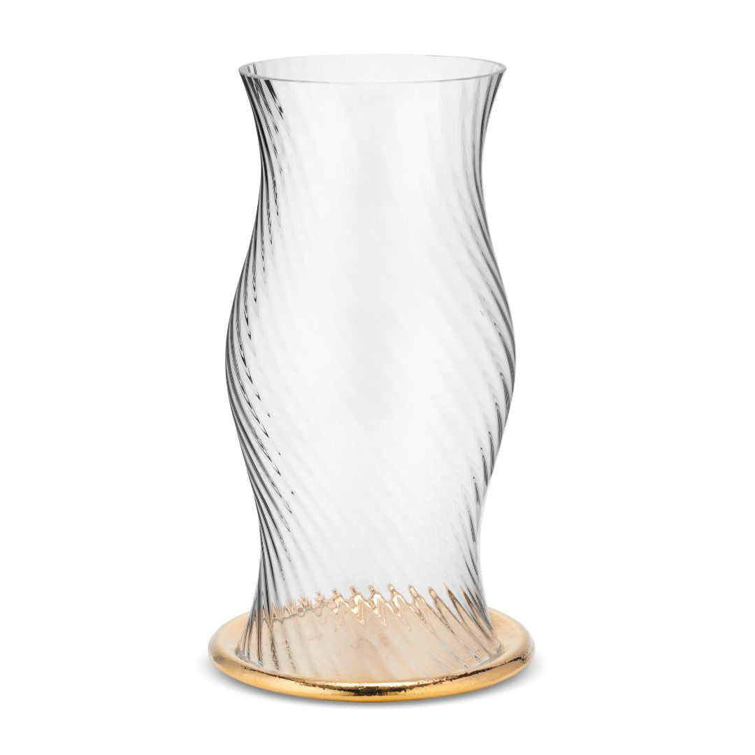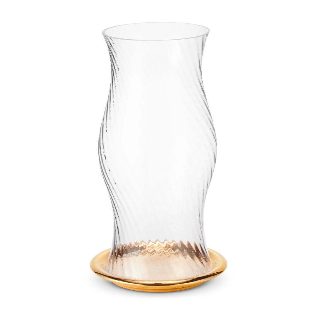 Mouth-blown by talented artisans, the Milla Hurricane by AERIN is inspired by vintage glassware. The perfectly proportional fluted form features elegant curves enhaced by an exquisite ribbed pattern, while the gold ceramic base gives it a more artisanal feel. Combine it with others of the same size, or with a different size to give your table varying heights.