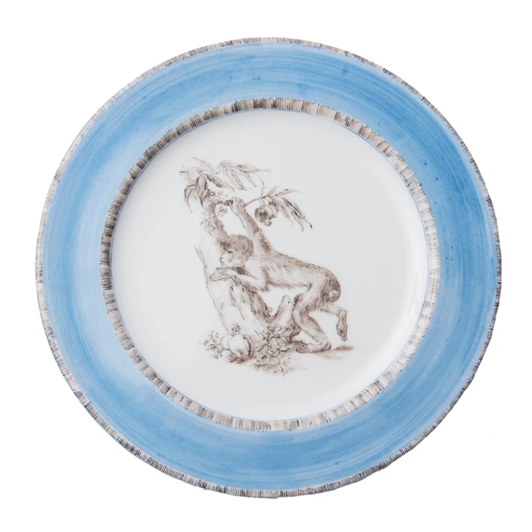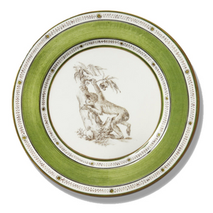 The Monkeys collection by Laboratorio Paravicini combines exotic whimsy with sophisticated imagery. This Milan-based brand is famous for applying the finest traditions of Italian pottery in its designs. The collection features 12 versions of monkeys surrounded by a richly elegant green Empire style border. They work beautifully as a full set, but are versatile enough to incorporate with other designs for an unexpected and dynamic table. Note that because each plate is uniquely crafted by hand, no piece is the same.